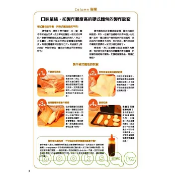 麵包,與料理不同,在實際製作的過程中,會衍生出很多意想不到的問題來。如果是完全沒有製作過的東西,由於缺乏經驗,自然就很難自行做任何的判斷。然而,製作麵包時,卻又得仰賴隨時留意麵糰等的狀態,來做出適當的判斷,才能夠做得好吃。因此,在策劃本書的初期,筆者特別確認過書中除了列出所需時間或溫度的數據之外,還能夠刊載許多圖片來補足數字所難以完整地傳達出的細節部分。所以,本書中除了時間、溫度之外,還收錄了大量的圖片,讓讀者能夠更清楚地分辨製作過程中的各種不同狀態。