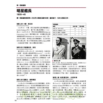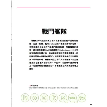 「深海狼群德意志國防軍:潛艦篇」,是一本詳盡的二戰德國海軍潛艇指南,內含豐富的彩色潛艇插圖。本書採獨一無二以艦隊為條目編排,提供完整的潛艇部隊編制剖析,細數北大西洋戰局伊始至帝國最後一日的戰歷沿革。每一章均含艦隊簡史、艦隊徽記、戰役的始末、以及著名的潛艇和艦長。德國潛艇的所有類型均有專文特寫,包括II型、VII型、IX型、XB型、XIV型、XVII型、XXI型、和XXIII型,以及各種基本型的演化型。