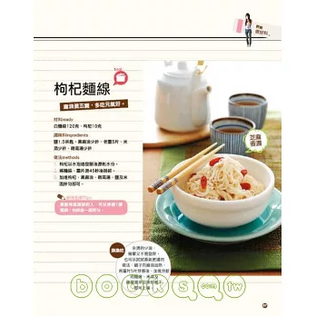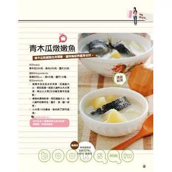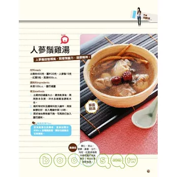 有不必開火,只要熱水一沖,馬上就能喝的漢方茶,甘甜滋味讓你天天都想喝;有滿足你享用各種料理慾望的5大單元:〈網路熱門人氣補〉收錄時下熱烈討論的人氣料理,讓你吃補不落伍;〈輕鬆做好菜〉設計各種蔬菜、鮮魚、肉類以及飯、麵料理,讓你吃得健康也吃得美味;〈快樂燉靚湯〉獻上超好燉的鮮美好湯,讓你不必苦守寒窯,就能輕鬆享受熱呼呼營養好湯。還有〈簡單做甜點〉,就算吃甜點,也可以同時做保養!創意單元「不感冒元氣食」搜集治療感冒初期的經典偏方,教你只要吃吃好料,就能治好小感冒。