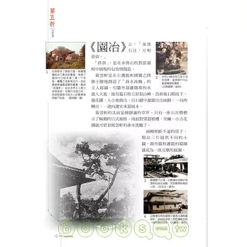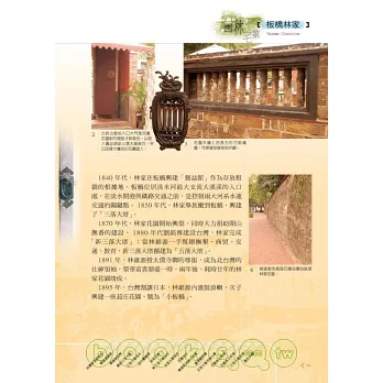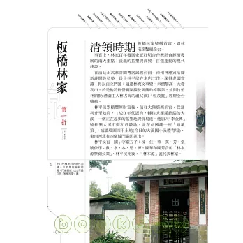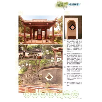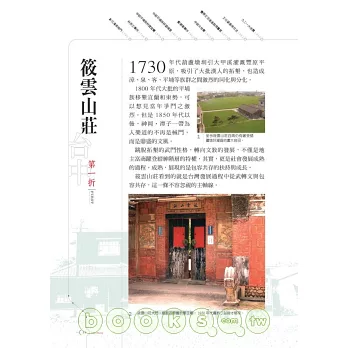 本書跳脫傳統描繪建築的方式,依照台灣由南至北的開發過程,循序介紹台南德聚堂、夢蝶園、屏東佳冬蕭宅、彰化鹿港八郊、台中筱雲山莊、霧峰林家、新竹開台進士第、桃園范姜五宅、台北老師府、板橋林家、宜蘭吳沙大厝……等台灣著名的園林與宅第共二十九處,就其建築之美、歷史背景與創建者之家族發展背景一一細說,讓讀者得以捧讀,並進而攜以巡禮各園宅,作為回溯台灣史之引道。