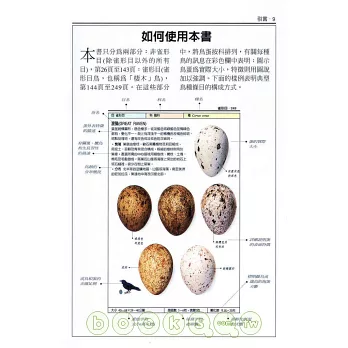 本書提供三種檢索方式,讓你依需求選用。如果你知道你要找的鳥蛋屬於哪一大類的鳥類所產,可以從目錄中查到該分類的首頁頁碼,進而縮小範圍,逐步查詢。如果你已經知道鳥類的中文名、英文名或學名,就可以在書末的索引查到它的所在頁面,進入條目,查詢更詳細的資訊。另外,為幫助初入門的讀者,本書在引言中設計有圖文並茂的檢索單元,讓你也可以在這裡依照鳥的目、科,按圖索驥,縮小查詢範圍找到目標。