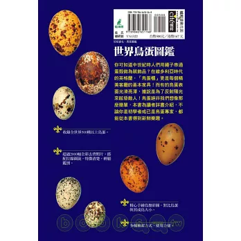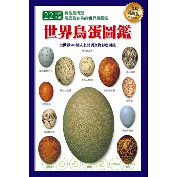 權威的內容,清晰的照片及有系統的論述方式,使本書成為世界知名鳥蛋圖鑑。書中囊括500種以上鳥類的蛋,詳實的資料讓讀者能迅速辨識出各式鳥蛋。每種鳥蛋介紹都力求文字精準,並配有彩色照片顯示蛋的主要特點與鑑別特徵,彩色條格則讓讀者迅速查閱出有關鳥蛋的各種資料。附於書後的名詞解釋則有助於讀者理解書中出現的專有名詞,不論你是初學者或已是鳥蛋專家,都能從本書得到新鮮樂趣: