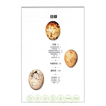 你可知道中世紀時人們用繩子串過蛋殼做為裝飾品?在維多利亞時代的英格蘭,「鳥蛋櫃」更是每個精美客廳的基本家具!能工巧匠雕刻後的鴕鳥蛋顯露出淡黃與乳白色的層次,再用白銀鑲嵌,放在華麗的銀托上…而有的鳥蛋表面光滑亮澤,據說是為了反射陽光來眩昏敵人!鳥蛋絕非我們想像那麼簡單,本書為讀者詳盡介紹鳥蛋的分類、鳥蛋的形狀、色澤、斑點,書中鳥蛋以實際大小呈現,讓你感受更真切。