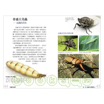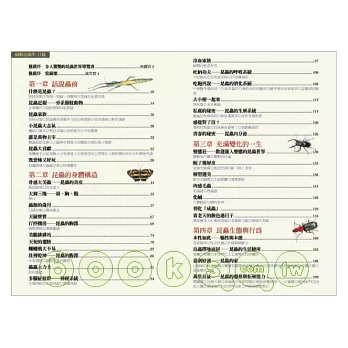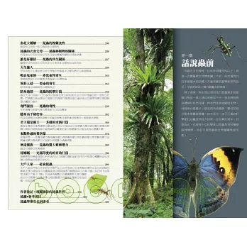 本書共分四章,第一章「話說蟲前」,介紹昆蟲的主要特徵、昆蟲的親戚、各目昆蟲及昆蟲的益或害,帶引讀者跨過昆蟲學之門檻。第二章「昆蟲的身體構造」,介紹昆蟲的基本形態構造,包括表皮、頭胸腹各部位及內部器官系統的詳細構造和功能,有許多繪圖輔助說明,使得原本枯燥無味的形態學變得生動易讀,讀者若能細嚼啃讀,將能掌握昆蟲分類鑑定所依據的形態特徵。第三章「充滿變化的一生」,介紹昆蟲成長發育的過程,包括變態種類、蛻皮、各類的卵、幼蟲和蛹的形狀及成蟲的羽化等;昆蟲發育過程的千變萬化,使其成功地適應陸地環境,也吸引人們的好奇觀察,往往成為科學的研究主題或文學歌詠的題材,讀者也可藉由觀察昆蟲的生命歷程,體察讚頌生命的奧秘。第四章「昆蟲生態與行為」,為本書的特色所在,圖文約佔半本書的篇幅,可謂是作者多年蒐集累積的成果,分別介紹昆蟲的驅性與本能、生活棲所、遷移及拓殖、與植物的關係、共生關係、求偶、防禦及育幼等行為,最後以社會昆蟲的生態作為本書的結尾;昆蟲種類繁多,各自發展出獨特的生態與行為,吾人即使窮究幾個世代也無法全盤了解多數昆蟲的生活習性,因此人人都可加入探訪奇異昆蟲世界的行列。