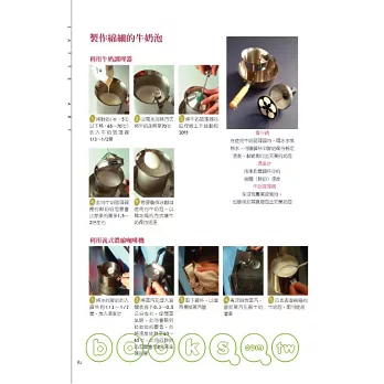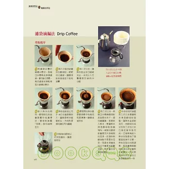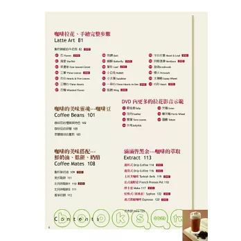 全書超過200張詳細傳授細節與訣竅的步驟圖,不僅有濾杯式、濾袋式、虹吸式、土耳其咖啡、摩卡壺、義式濃縮…等6大基本沖煮法的完整步驟圖,更附上邱老師親自示範的詳細影音教學120分鐘DVD,各種咖啡拉花、手繪圖形、鮮奶油打發、鬆餅、奶酪…應用示範。