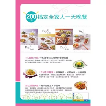 由於每天的晚餐是家人聚在一起的歡樂時光,也唯有在這個時候家人們才有時間閒話家常,因此在《超省錢家庭套餐》中我設計了4週20款晚餐套餐,每餐4菜1湯只要200元,除了可吃到紐奧良雞翅、香滑雞塊、高昇排骨、西蘭花牛肉片……等,豐富的佳餚滿足一家四口味蕾,菜色美味、營養又簡單易學,又不用花大錢,輕鬆解決主婦們每日的餐桌問題。