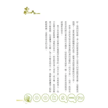 對男性而言,本書也有它的用處。如果能夠洞悉女性行動背後的真正意圖,就不會輕易上女人的當,讓自己死無葬身之地。遺憾的是,即使得知「技巧」,並不保證從此可以立於不敗之地。任憑你頭腦再怎麼清楚,多少仍是會誤入歧途。