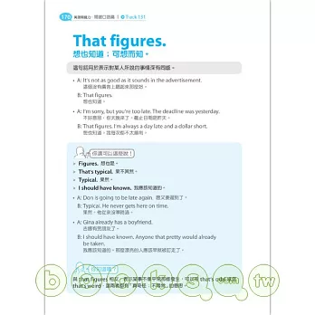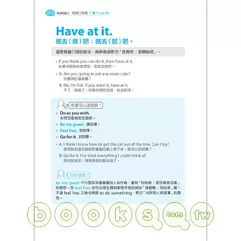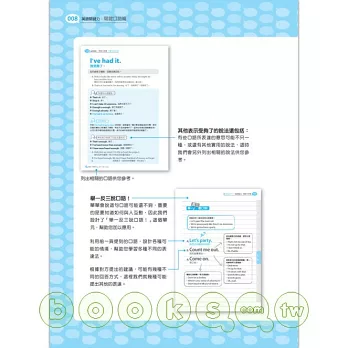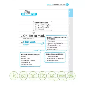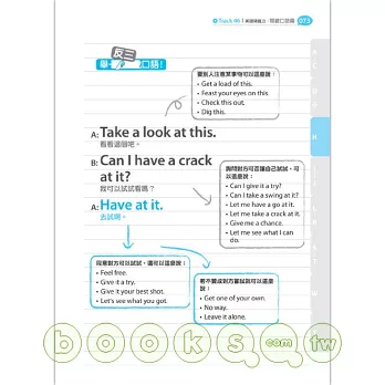 .涵意說明-中英對照方式呈現每句口語的涵意及使用時機,並附有例句協助讀者加深印象