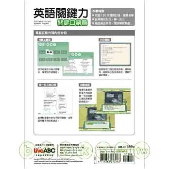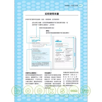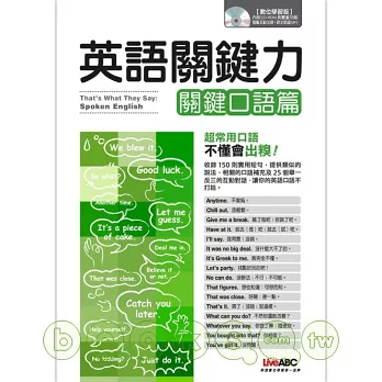 懂得越多的口語,越容易在應對時直接反應,為了讓英語學習更輕鬆有趣,我們依字母順序分為8個單元,包含下列幾個部分:首先,每頁開始以中英對照方式清楚呈現每一句口語,並針對該句口語說明其涵意及使用時機,之後提供例句幫助讀者了解用法以加深印象。第二部分提供該口語相關的類似說法,例如中文的「我同意」,英文就有I hear you、I agree、I’m with you等各種不同的說法,一網打盡所有常用口語。第三部分為延伸學習,從第二部分的句子中挑選一至二個口語,補充有趣的典故或特殊用法,讓你在學習英語的同時能獲得更多的語言知識。最後一個部分則是在每單元後附上的四種測驗,可以隨時評量自己的口語能力。另外,英文除了要能聽得懂,還要能說出口,隨書搭配的MP3收錄外籍老師錄製的正確發音,讓你邊聽邊學,進而會聽也會說。