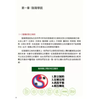 本書將中醫的陰陽學說、五行學說、藏象學說、病因學說、病機學說等理論的相互關係,以淺白的內文配上輕鬆的插圖,讓你一看就明白。