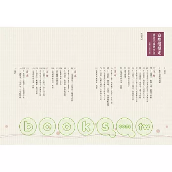 作者若村亮身為京都資深觀光導遊,他以寺院的典故、故事等將京都的深奧魅力,完整地呈現給讀者。不論是洛東的南禪寺 ~ 哲學之道 ~ 銀閣寺行程,處處引發沉思、撫慰心靈的散步道;洛中的京都御所 ~ 相國寺 ~ 下鴨神社行程,尋訪平安時代的風雅,遊逛甜點茶屋的樂趣;洛北的詩仙堂 ~ 曼殊院 ~ 修學院行程,探訪知名庭園,享受舒適悠閒的風景;洛西的金閤寺 ~ 仁和寺 ~ 妙心寺行程,世界遺產林立,從巡訪名剎中感受京都滿滿的幸福;洛南的泉湧寺 ~ 東福寺 ~ 伏見稻荷行程,造訪有獨特風格的伽藍以及朱紅鳥居之景……等等,書中這18個行程都是大約半天可以走完的距離,多走一步或兩步,慢慢散步遊逛,品嚐高雅的京果子、懷石料理,尋覓豐富的原創和風雜貨小物,求得祈願記念的御守,帶您體驗深奧歷史傳承下的京都新魅力。