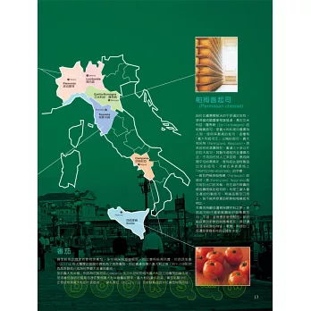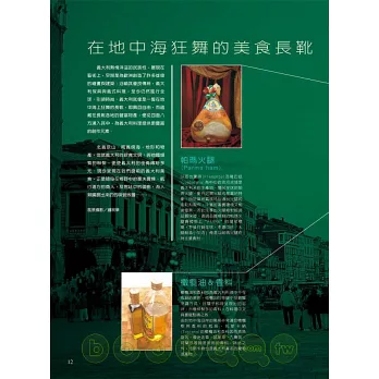 北義依山、南義傍海,地形和物產,造就義大利的飲食文明;與他圖頻繁的聯繫,更使義大利的佳肴繽紛多元。現今呈現在我們面前的義大利美食,正是隱身在鄉野中的農夫農婦、航行遠方的商人及宮廷中的御廚,為人類擴展出來的味覺版圖。