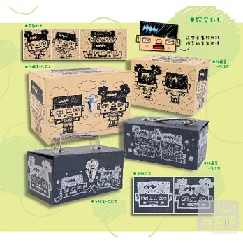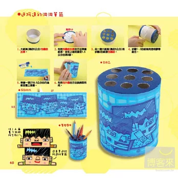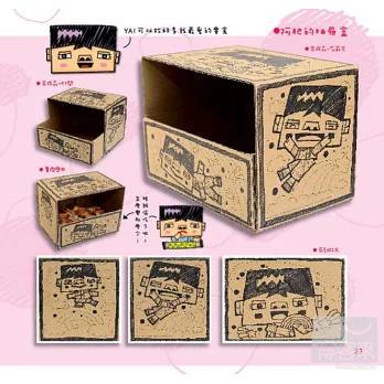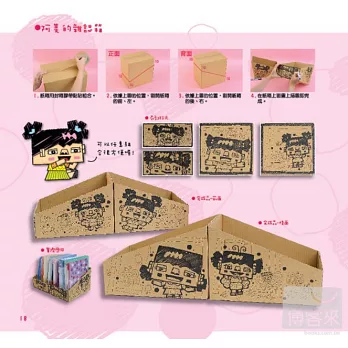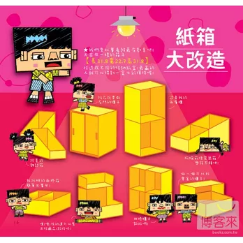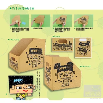 此外,作者更利用相同的紙箱作出二格箱、四格櫃、抽屜櫃...等多種不同的變化!膠帶用完的紙筒,也可以變成精緻的筆筒、三層櫃、杯盤組...等,環保又實用!兩者一起使用,更有您意想不到的變化!詳細的步驟,跟著做一定做得出來!讓可愛的公仔帶您一起DIY吧!