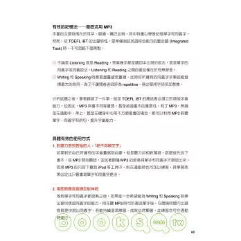 TOEFL iBT 聽、說、讀、寫四大考試項目的共同特色,是測驗考生「單字.同義字的替換能力」。因此,除了積極擴充單字量,還必須多看、多聽、多唸、多寫,才能有效提升字彙替換能力!