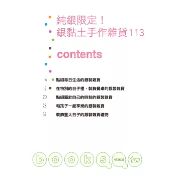 本書詳細介紹銀黏土的工作、製作方法…等基本知識,以生活用品為主,包括相框、鈕釦、掛飾…收錄作品113件,其中16件為日本Art clay銀黏土大賽的得獎作品,特別展示以供讀者參考。
