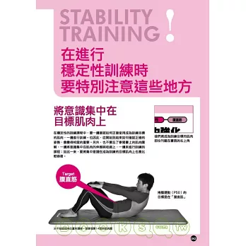 所謂的核心肌群訓練是由,獲得穩定性的穩定性(Stability)訓練課程;以擴展關節的可動區域為目的,進而提升肌肉柔軟度的可動性(Mobility)訓練課程;及讓穩定性與可動性能夠相互連動作用的連動性(Function)訓練課程,等3個主要元素所構成的。