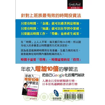 大部分人投注的「投資的時間」恐怕連一天的十分之一都不到。本書的宗旨就是要告訴讀者,如何增加這種「投資的時間」,並針對一般人明知很重要卻不知道怎麼改善的情況,在後面的內文中帶領大家逐漸掌握個中竅門。