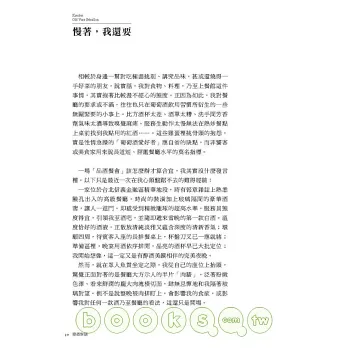 本書中,我嘗試將自己和葡萄酒一路相知相惜的歷程,叨叨絮絮、不厭其煩地寫下。正是發展出親密關係的情感歷程,乃至其中的失敗挫折,讓我可以在大賣場或葡萄酒專賣店、或從一份餐廳的酒單上,選出一款當下最適合自己的酒。作為生命中諸多美好事物之一,葡萄酒只是恰好具有讓其他美好事物更美好的魔法。