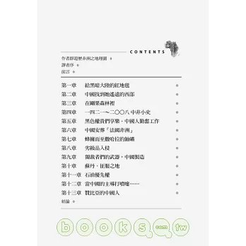 為了回答這些問題,作者群花了二○○七年一整年的時間,遊歷了非洲十五個國家,行遍整個大陸地,就為了一窺這個「中國非洲」的真貌。法文原著於二○○八年五月二十日面世,紀實報導的行文方式,語調時而幽默、諷刺,現場歷歷在目。為了更方便中文讀者的閱讀,中譯本做了部分增修(例如還原中國人的本名,無法查證的人名則維持音譯)。書中十二個章節,從被砍伐精光的剛果森林到受了毒害的奈及利亞河岸;從嚴密監視的尼日沙漠,到遍布輸油管的蘇丹;從中國製造的埃及觀光紀念品,到喀麥隆港都杜阿拉(Douala)的超巨大中國餐廳等。從貧困的中國農村迎向這神祕的新大陸,非洲正在向這群勇敢犯難的冒險者開放!