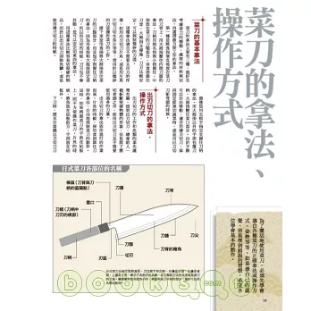 本書從菜刀的基礎知識開始,以一連串的分解照片,淺顯易懂地解說片魚的方法、生魚片的切法、蔬菜的切法、裝飾切法的技術。並貼心附贈「刀工技術□基本動作DVD」,使讀者得以透過影像輕鬆學習基本動作。