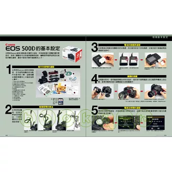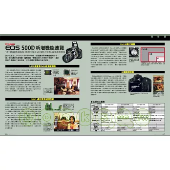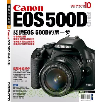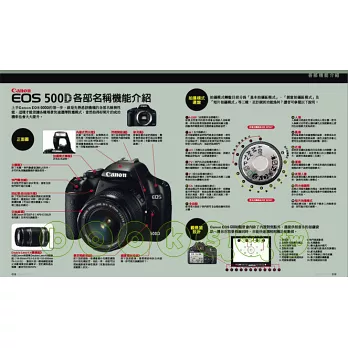 為了讓讀者能對於EOS 500D能有更深入的了解,本書除了將以深入淺出方式介紹EOS 500D各項性能外,還會針對適用配件與軟體進行深究,讓你即使是個攝影初學者,也能快速操控上手。