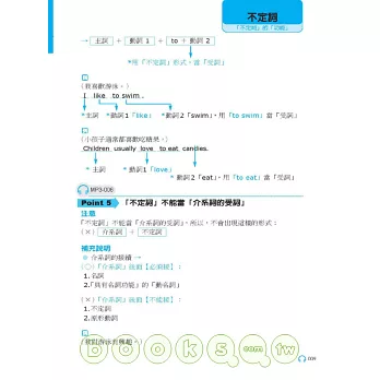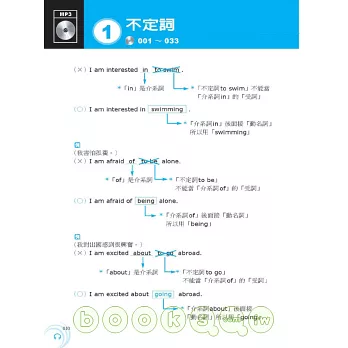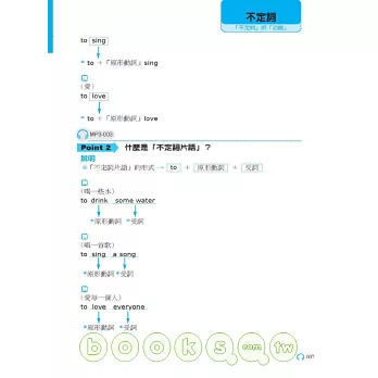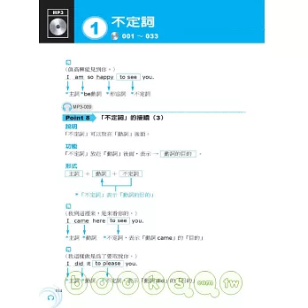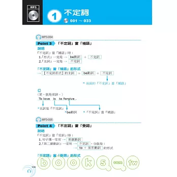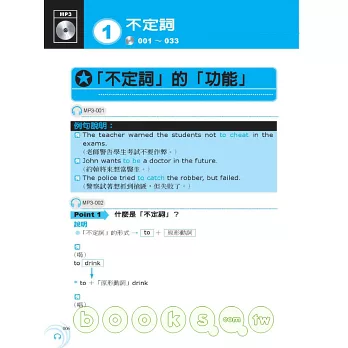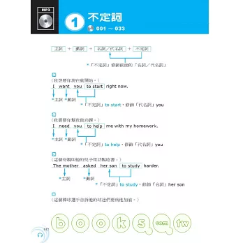 本書每一文法概念均包含「文法基本介紹 + 例句說明」,MP3以中英搭配方式錄製,可完整聽到全書內容: