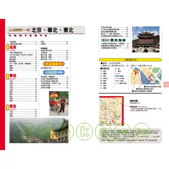 本書內容除了介紹首都北京,還介紹中國的華北與東北地區。作為黃河流域文明發源地的華北地區,擁有為數眾多歷史文化遺跡,已列為世界遺產的雲崗石窟與龍門石窟、平遙古城、承德避暑山莊,在在讓人體驗古文化的迷人與浩瀚魅力。嵩山少林寺,洛陽白馬寺也是不能錯過的必遊景點。天津與青島曾為列強的租借地,兩座城市皆充滿造型迥異的歐風建築。
