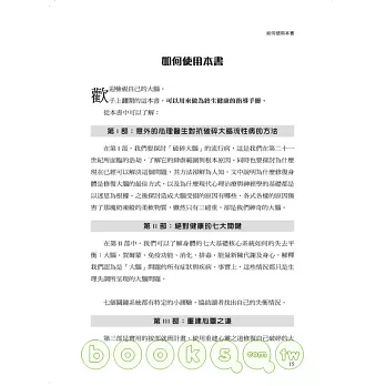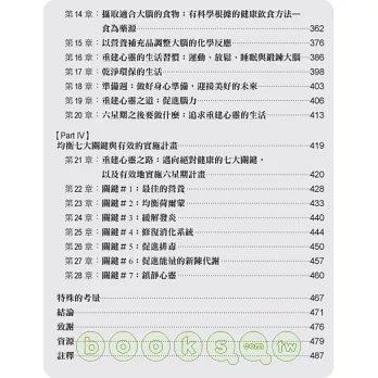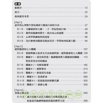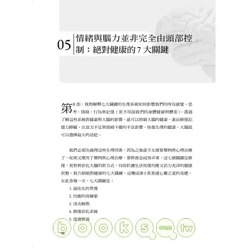 第II部,解釋七大關鍵的生理系統如何影響我們的所有感覺、思考、情緒、行為與記憶,進而修復記憶力障礙、注意力不足與情緒干擾的不良影響。七個關鍵系統都有特定的小測驗,協助讀者找出自己的失衡情況。