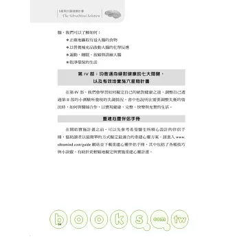 第III部,提供保養大腦的六星期計畫,說明讓大腦快樂、注意力集中、靈敏、清楚與投入所需的基本元素,我們可以知道如何: