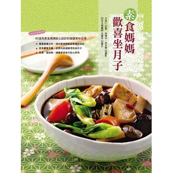 本書專為吃素的媽媽設計,由茹素二十年的烹飪老師-王培仁設計八十道健康、美味的坐月子料理,分為主菜、配菜、湯品、主食、點心共五大類,由前台大營養師-宋臺英的專業營養成分分析,兼顧美味與營養,讓產婦的飲食不再只是麻油雞腰子等食材,吃素也可以照樣坐月子、照樣調理出健康的體質。
