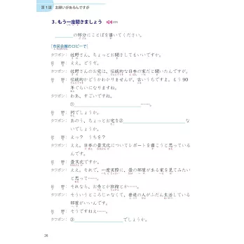 3.【會話練習】:以能傳達清楚內容為目標,使用會話中的表現,看圖重現會話情境。