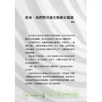 然而,促使我決意翻譯這本書的緣由,除了想與人分享這個演化上的重大事件,以及書中所列諸多的遺傳、發生、解剖上的演化證據外,本書作者蘇賓在書中隱約所透露的,他如何由一位冷門科學的學者,成為國際頂尖期刊(如《自然》、《科學》)的常客,毋寧更讓我心動。