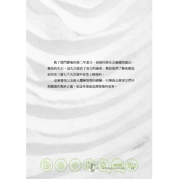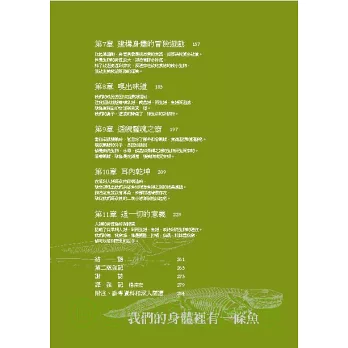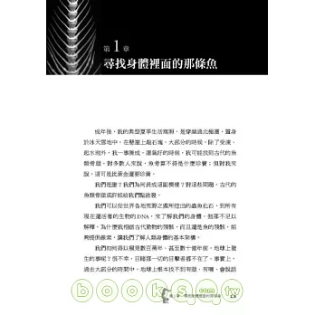 教了那門課後的第二年夏天,我與同事在北極圈挖掘出一條魚的化石。這化石提供了有力的線索,幫助我們了解魚類是如何在三億七千五百萬年前登上陸地的。這個發現以及教人體解剖學的經驗,引導我去探求它們中間關連的奧妙之處。而這本書就是探索後的成果。