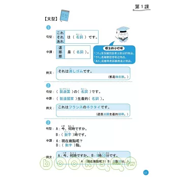文法解說針對本課最重要的句型,提供例句讓讀者更為了解,小博士們也會在要注意的地方出現,給予讀者文法小叮嚀。