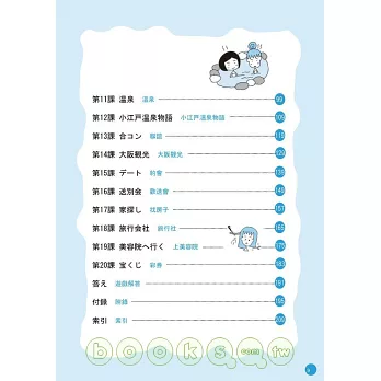 每課最後則附上小遊戲或是和日本文化相關的小知識,讓讀者在學習之餘,能夠透過小遊戲輕鬆一下,也更了解日本。