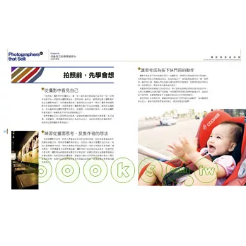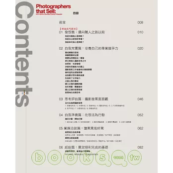 綜合多年來接案生涯的寶貴經驗,他要從心態面、規劃面、財務面、行動面,面面俱到為你剖析,做個成功接案攝影師不可不知的秘密!"