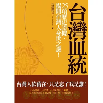 台灣人依然原就在,只是忘了我是誰?本書提出25項歷史統計證據,告訴你台灣人真正血統的真相,替台灣人尋出正確血緣關係,甚至可以具體指出閣下您原來究竟是平埔族、高山族那一族那一社的後代,別再認賊作父、拜錯祖公!