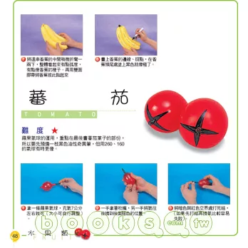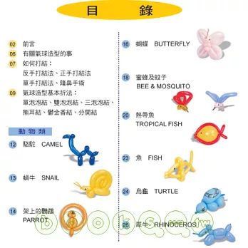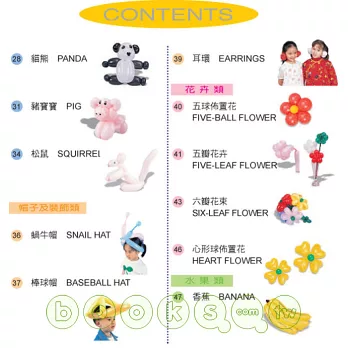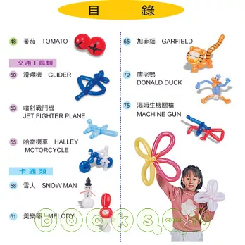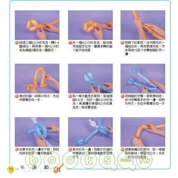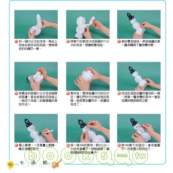主要是增加了一些不同種類氣球所做的造型,及一些組合的造型,尤其還有佈置用的造型。色彩清晰,適合各種不同需求的讀者,周邊的照片插圖是造型的應用,相信讓您的氣球應用空間會更寬廣,希望你能快快樂樂玩氣球。輕輕鬆鬆學造型。