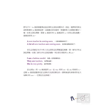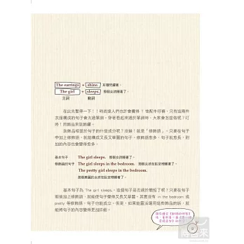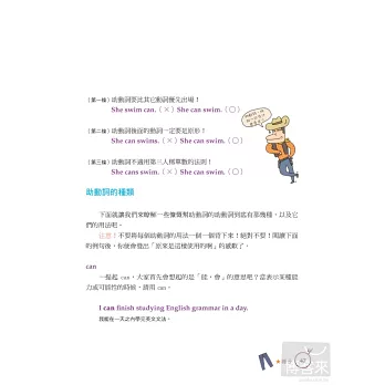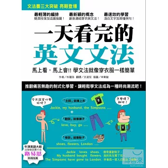 本書的每頁編排刻意控制字數,並輔以逗趣圖解,讀來流暢輕鬆。每個文法概念都有實際例句;淺白的文字幫你一一釐清觀念,避免混淆。一天看完英文文法,一天學會英文造句!沒學好文法的人、想接觸英文的人,統統都可以看,統統都可以學會。如果你曾經放棄,別再錯過這本文法書拯救你的機會!