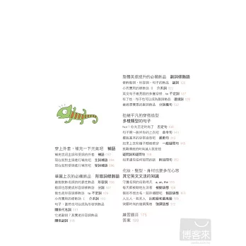 如果你對於英文造句的主詞、動詞、受詞排列已很熟悉了,卻敗在「疑問句」的構成,看看「如果上衣(主詞)和褲子(動詞)顛倒著穿」這個單元!想進一步學「命令句」和「強調語態」,就看「句子啊~脫掉你的上衣吧」和「突顯時尚的強調風格」,保證一學就會。