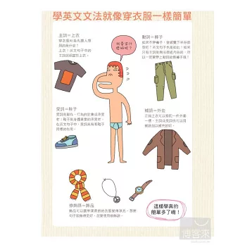 英文句子的句型不外乎主詞、動詞和受詞的排列變化,而主詞就像上衣,動詞就像褲子,受詞就像鞋子。懂得穿上衣服、褲子與鞋子,也就懂得造英文句子了,一點也不麻煩!