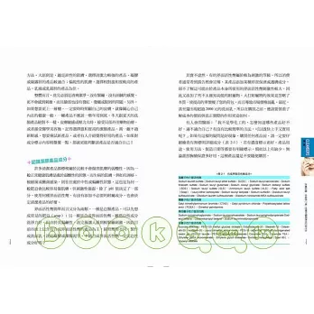 1.實用的參考表格:書中將保養品中密密麻麻的成分,製成表格,例如:?清潔用品中介面活性劑及卸妝產品的成分、保溼鎖水劑的種類、各種防曬成分及其使用限量、美白成分與其上限濃度等,讓讀者一目了然。
