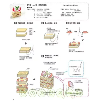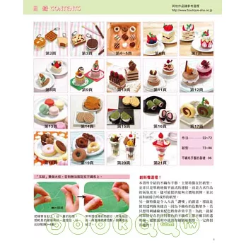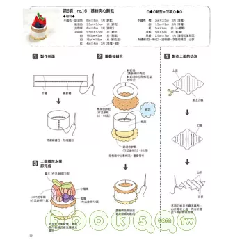 不僅做法容易,作者中川美喜小姐運用了創新的紙型,讓不織布作的甜點更有立體感,並且使用透明的線製造出想要的紋路或讓作品更逼真