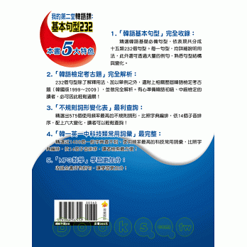 232個句型除了解釋用法、加以舉例之外,還附上相關歷屆韓語檢定考古題(韓國版1993 ~ 2009),並做完全解析。有心準備韓語初級、中級檢定的讀者,必可因此輕鬆過關!