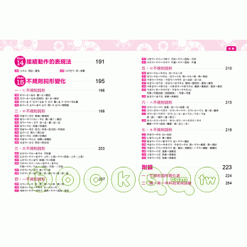 精選出575個使用頻率最高的不規則詞形,比照字典編排,依14個子音排序,配上六大變化,讀者可以輕鬆查詢!