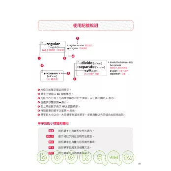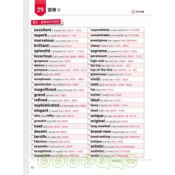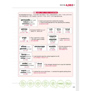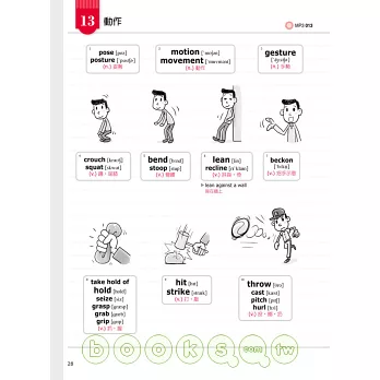 坊間的單字書多以字母序排列,收錄的單字雖多,背起來卻毫無效率可言。其實,同時記憶同類或用法相近的單字才是最省時省力的方法。本書依照不同主題將單字分為130個單元,每個單元之下再細分為若干主題,用法類似的單字也劃分在同一單元裡。分門別類背單字,效率更高。