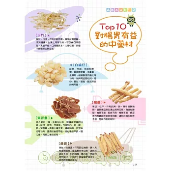本書分成2個單元,「Part1漢方腸胃道基礎保養篇」提供保養腸胃的基本漢方常識、測試小朋友腸胃健康的方法、十大有益腸胃健康的食物及藥材、10道保養腸胃健康必喝的飲品,讓寶貝平時就能保護腸胃健康。