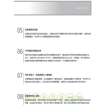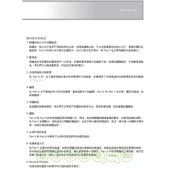 每回測驗的開始之處,為考生精心整理了重點講解,其中包含「句子的主詞和動詞」、「關係代名詞」、「名詞與動名詞」、「現在分詞與過去分詞」等介紹。此部分提供考生正確解題時首先必備的基本文法常識,還提出了經常困擾考生的問題要點。