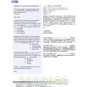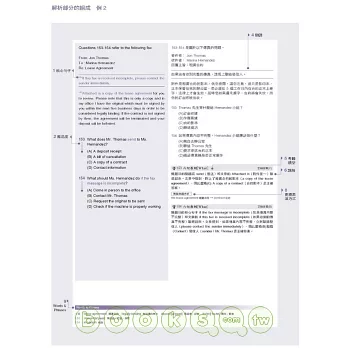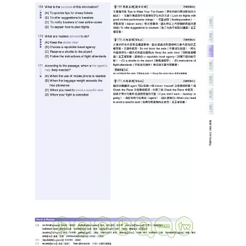 本書每回測驗的每道題目均有完整、細膩且為考生著想的精闢解析,其中包括「解題的核心句子或關鍵詞」、「難易度指示」、「段落及整句翻譯」、「考題類型」、「詳細講解」、「更換表達方式」、「必須牢記的表達」、「Words & Phrases」等,務求不遺漏任何對考生解題有益的內容,期望能真正幫助考生達成迅速閱題、有效拆題、正確答題的優異能力。