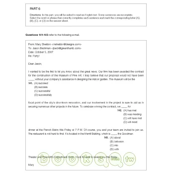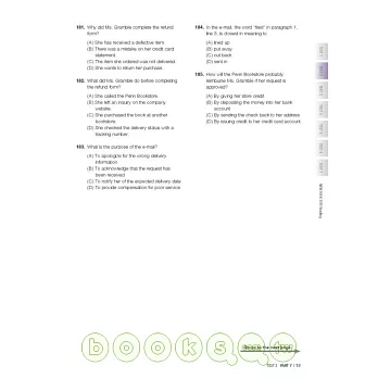試題本收錄了 7 回新多益閱讀測驗 Part 5(單句填空,101~140 題)、Part 6(短文填空,141~152 題)、Part 7 (單 / 雙篇文章理解,153~200 題)共100 題的全真模擬試題。每題均是精心打造,處處可見新多益閱讀測驗題型的精髓。